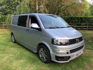 Genuine 18 Sportline alloys, full genuine Sportline Body Kit. Tailgate, Windows to the rear of the van with sliders for opening and ventilation. Daytime running lights on the front bumper. Chrome side bars, detachable Westphalia tow bar. Matt black roof bars.